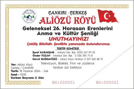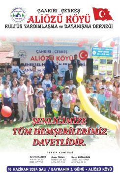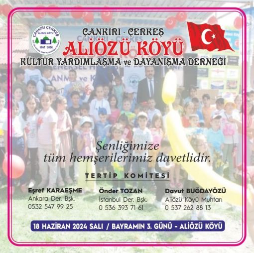 ŞENLİĞİMİZİ YAPACAĞIMIZ 18 HAZİRAN 2024 SALI GÜNÜ YANİ KURBAN BAYRAMININ ÜÇÜNCÜ GÜNÜ TÜM KÖYLÜLERİMİZİ,HEMŞERİLERİMİZİ SOSYAL MEDYADAN TAKİP EDEN TÜM VATANDAŞLARIMIZI ÇANKIRI-ÇERKEŞ-ALİÖZÜ KÖYÜMÜZ ŞENLİĞİNE DAVET EDİYORUZ.