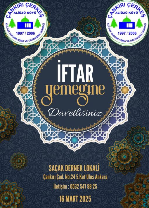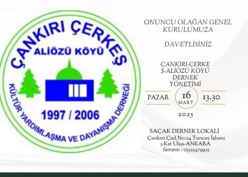 ÇANKIRI-ÇERKEŞ-ALİÖZÜ KÖYÜ DERNEĞİMİZİN 16 MART 2025 PAZAR GÜNÜ SAAT 13.30 DA SAÇAK DERNEK LOKALİNDE GENEL KURUL TOPLANTISI YAPILACAKTIR.