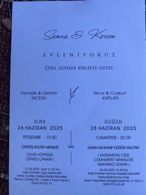DERNEK ÜYEMİZ OSMAN İNCESU KIZININ DÜĞÜNÜNE DAVET EDİYOR.OSMAN İNCESU "26 HAZİRAN PERŞEMBE GÜNÜ SAAAT 19.00 DA ÇERKEŞ KÜLTÜR MERKEZİNDE YAPILACAK OLAN DÜĞÜNÜMÜZE TÜM EŞ DOST VE AKRABALARIMIZ DAVETLİDİR. DEDİ."