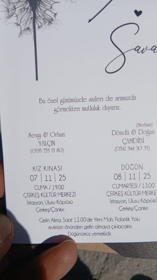MERHUM DOĞAN ÇAMDİBİ NİN OĞLU CUMHUR ÇAMDİBİNİN TORUNU DERNEK ÜYEMİZ SAVAŞ ÇAMDİBİ HAFTA SONU ÇERKEŞ TE YAPILACAK OLAN DÜĞÜNÜNE TÜM EŞ,DOST VE AKRABALARININ DAVET EDİYOR.